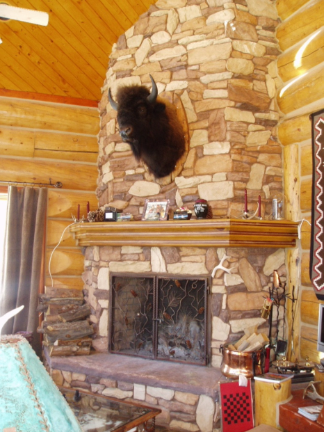 This ground up custom home build embraces the rugged beauty of a rustic cabin style, with warm wood tones and handcrafted finishes that enhance the home’s natural character. Vaulted ceilings draw the eye upward, providing a dramatic showcase for the owner’s impressive big game taxidermy collection.